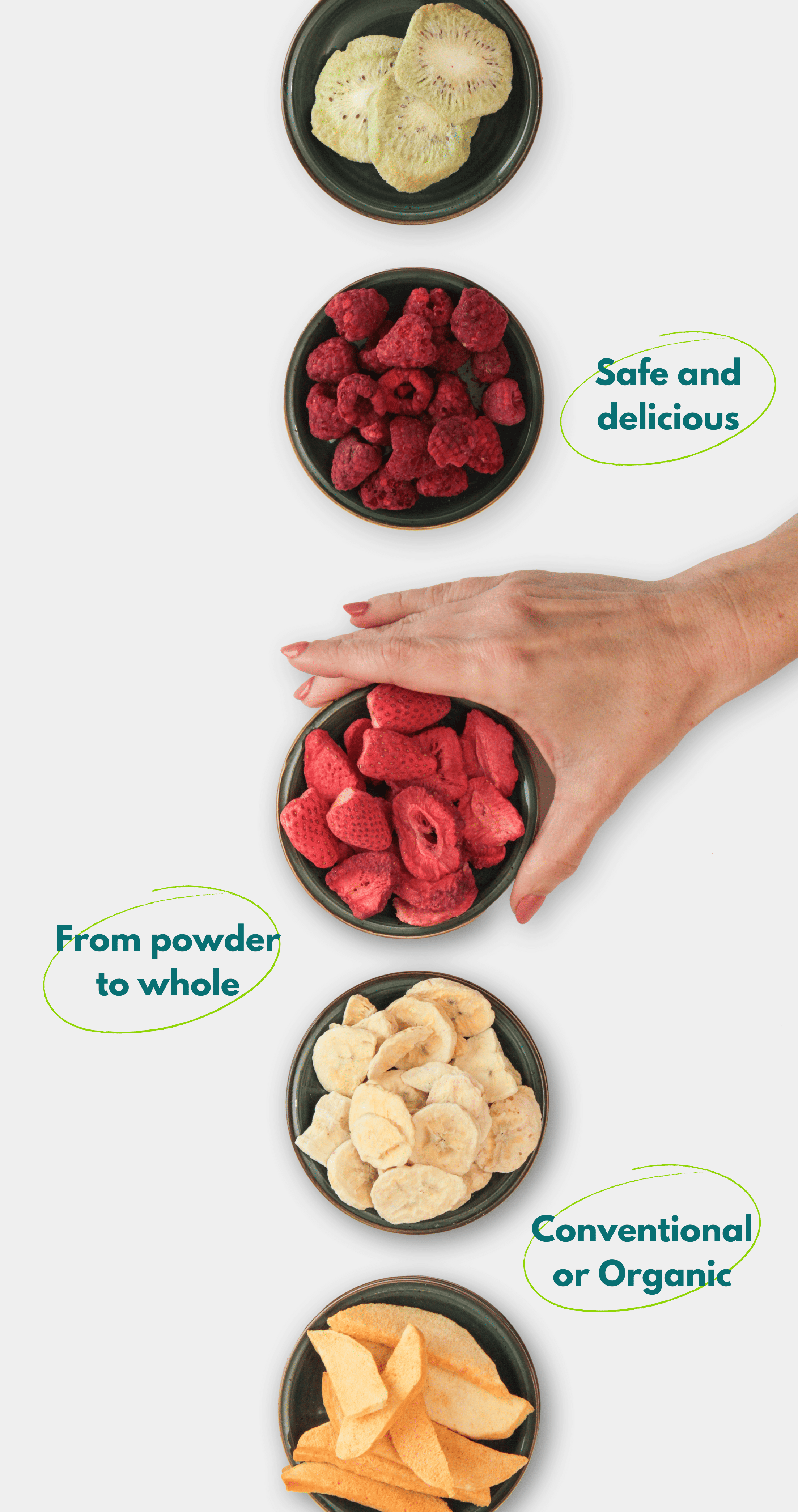 With over a decade of experience in industrial food processing, we specialize in solving complex production challenges. From selecting the best fruit variety, country of origin, harvest timing, we fine-tune our further process, cutting and freeze drying to deliver outstanding sensory quality.